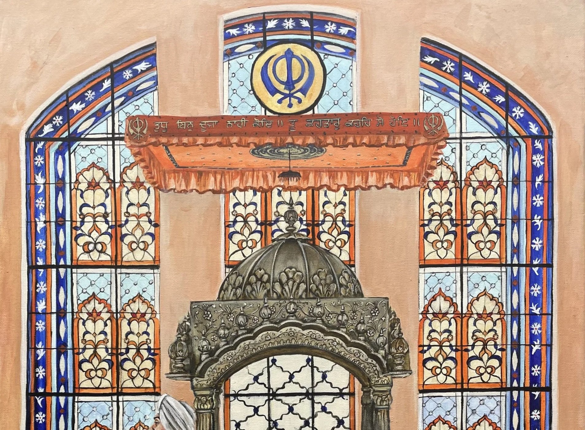This painting portrays a serene Anand Karaj ceremony at Sri Guru Singh Sabha Gurdwara in Southall. The couple chose the largest canvas size (20”x30”), which gave me the space to capture a high level of detail in the Gurdwara’s iconic stained glass window and the couple’s intricately embroidered attire.