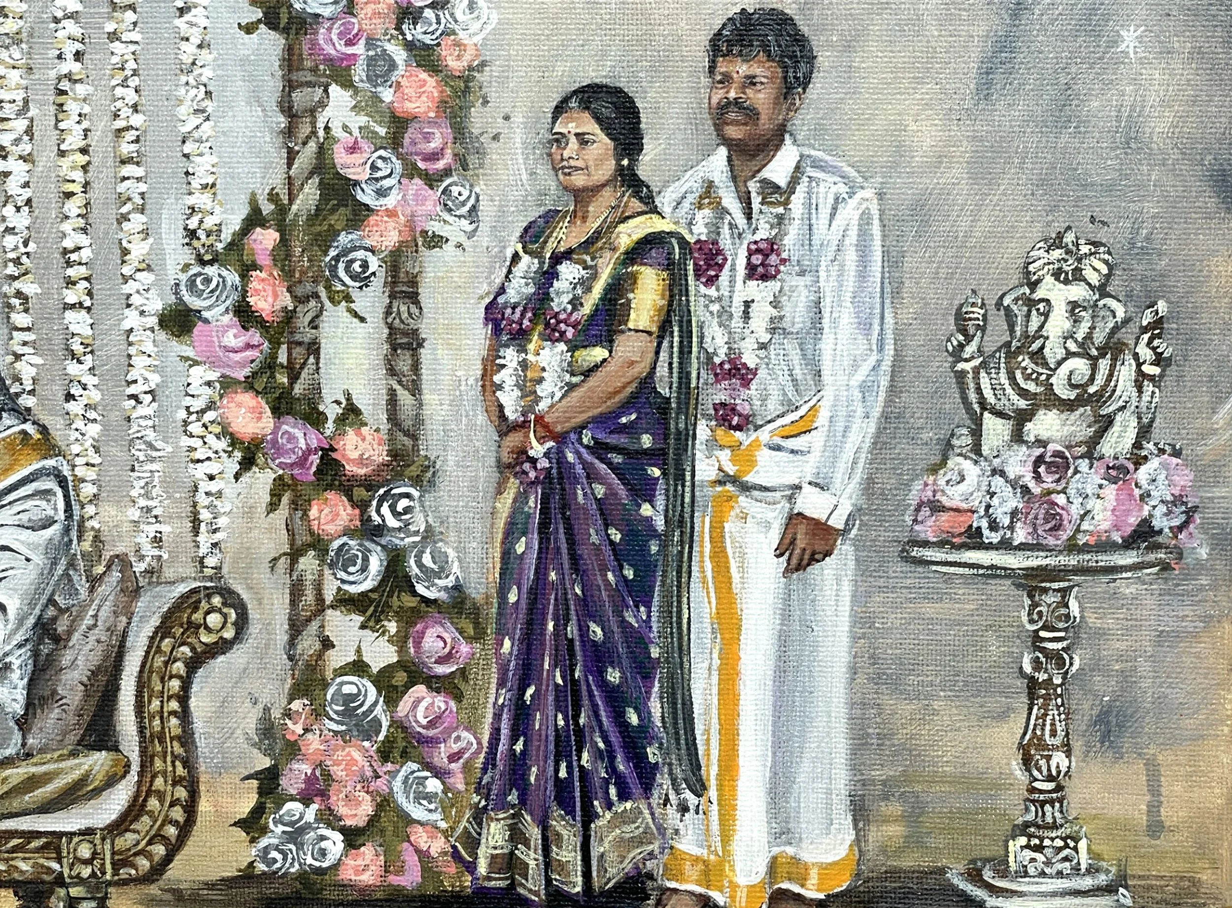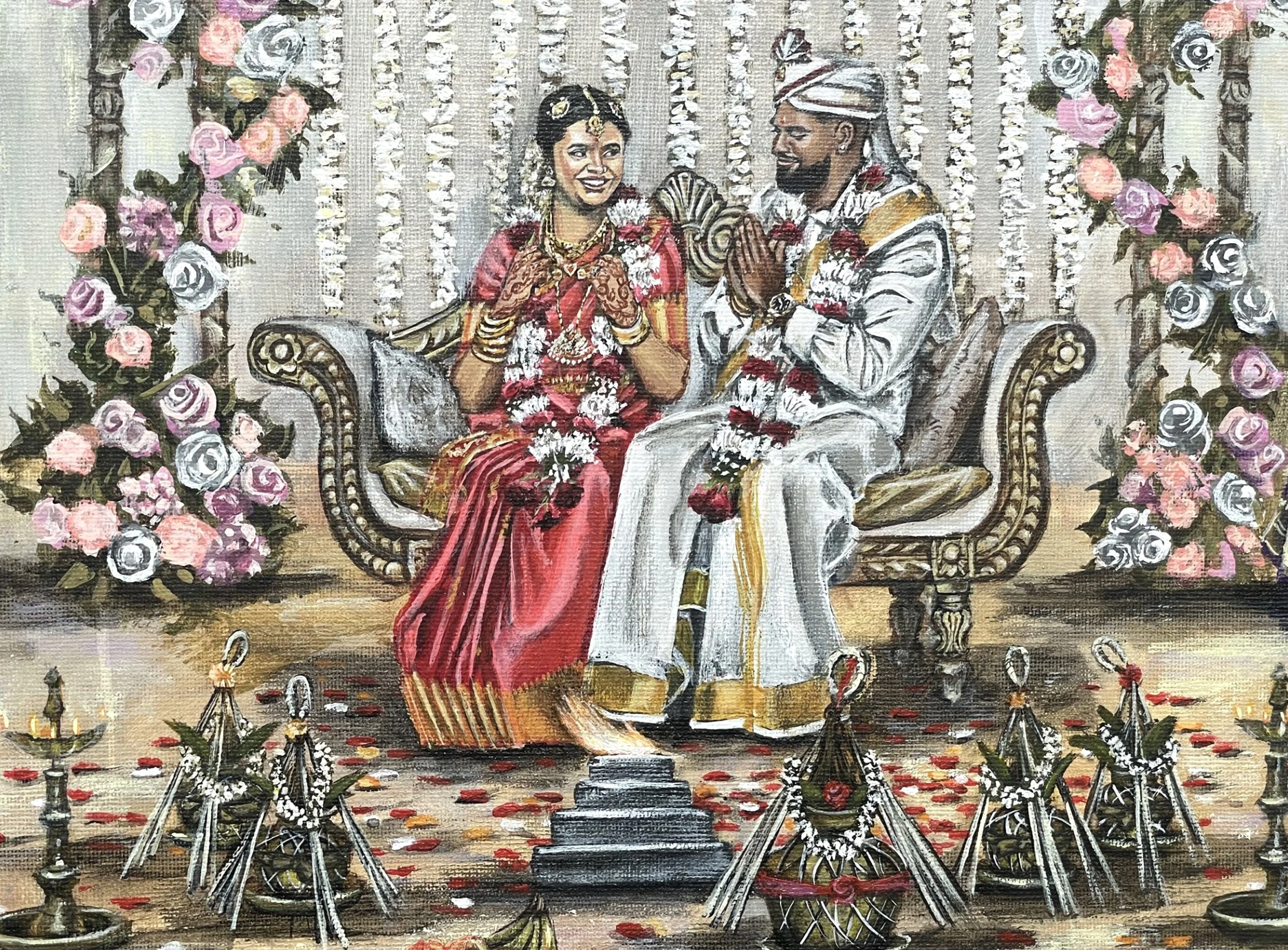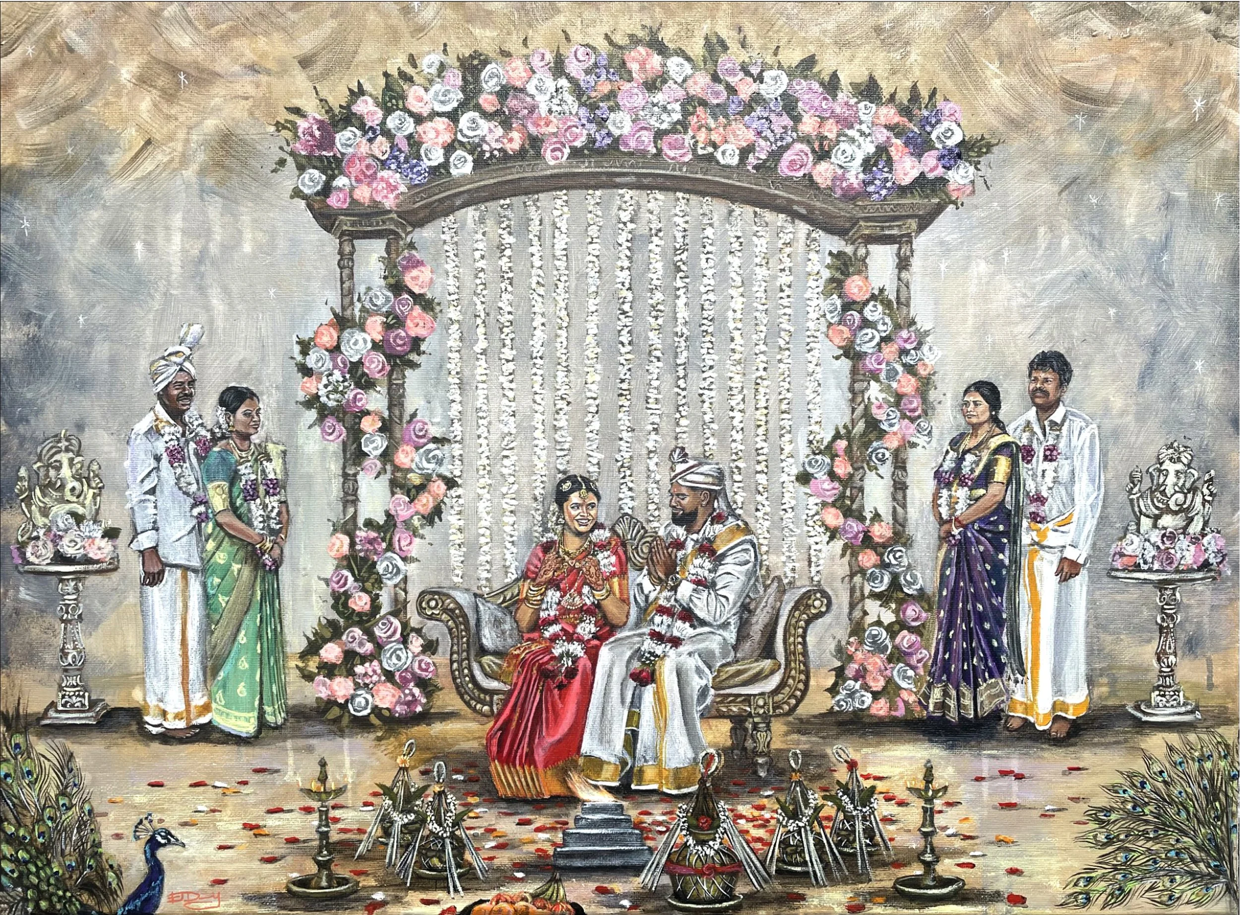 Maathula and Mounesan’s Hindu wedding at Shri Kanaga Thurkkai Amman Temple was such a meaningful piece to create. With the help of some reference photos, I was able to paint Mounesan’s late father’s portrait into the scene — a quiet, loving tribute that made this commission especially moving.