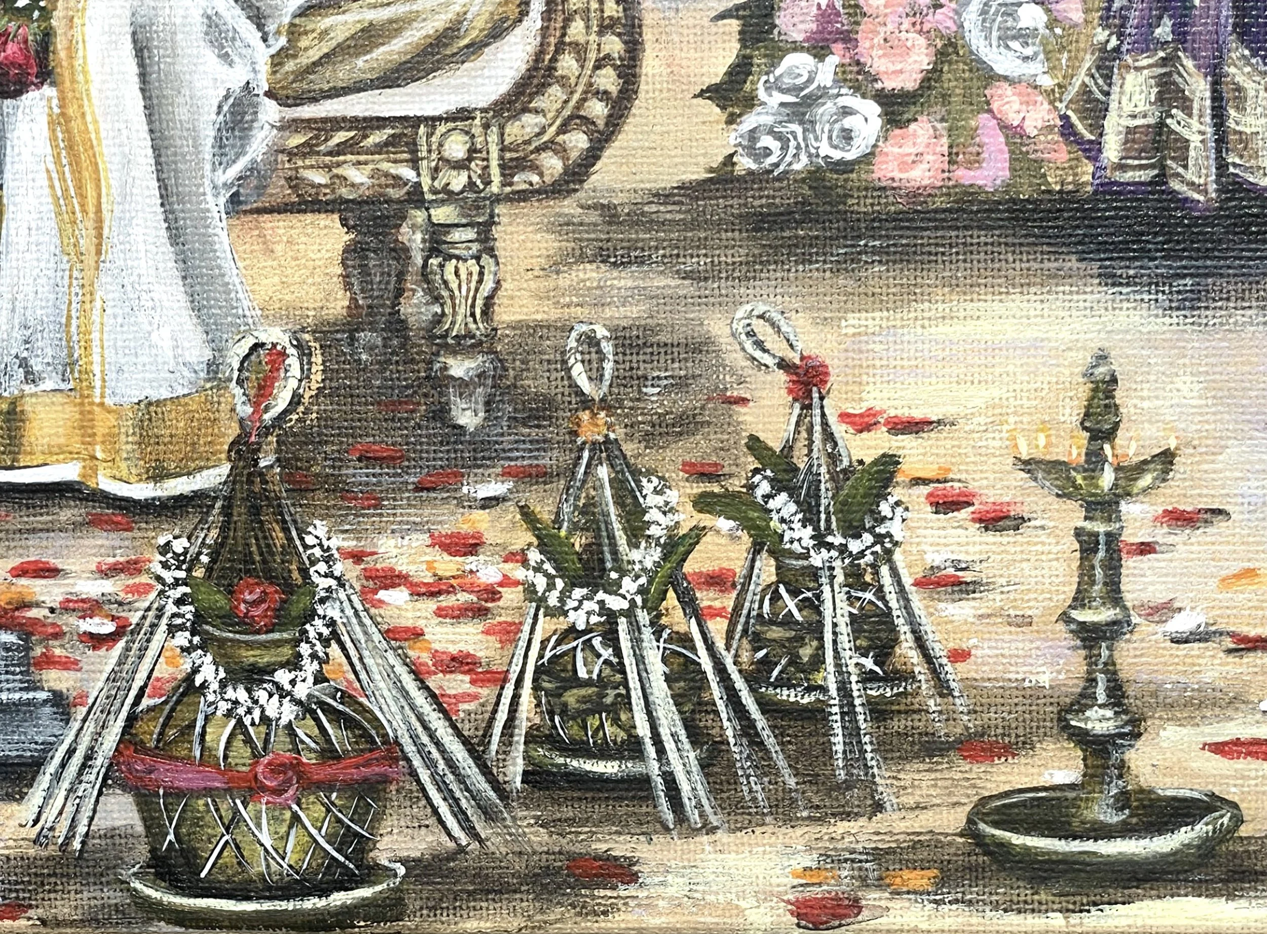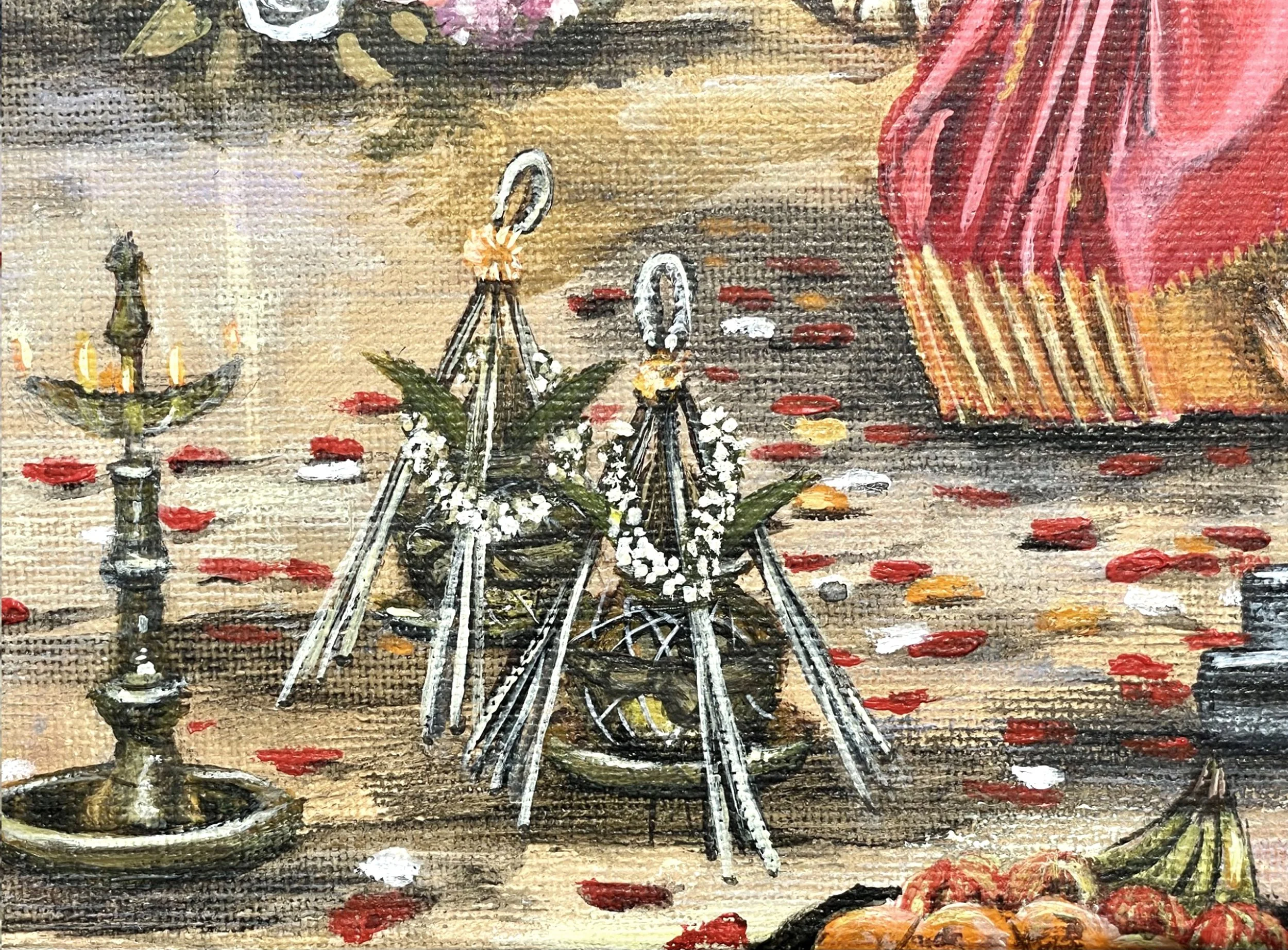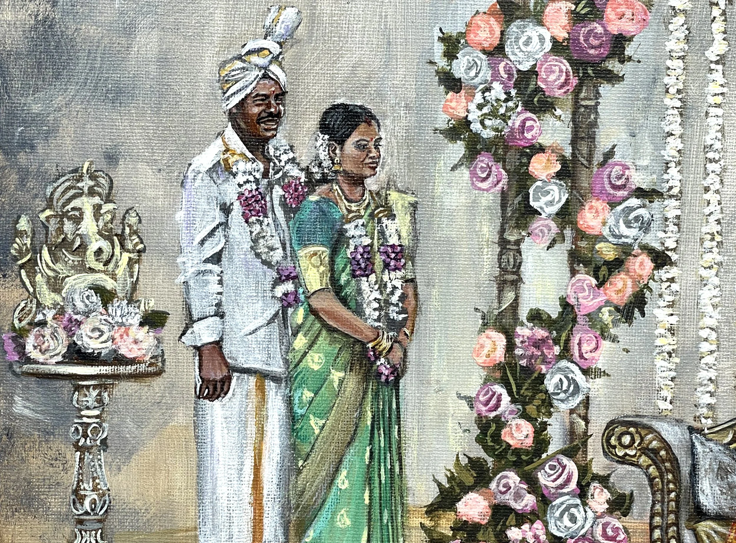 Maathula and Mounesan’s Hindu wedding at Shri Kanaga Thurkkai Amman Temple was such a meaningful piece to create. With the help of some reference photos, I was able to paint Mounesan’s late father’s portrait into the scene — a quiet, loving tribute that made this commission especially moving.