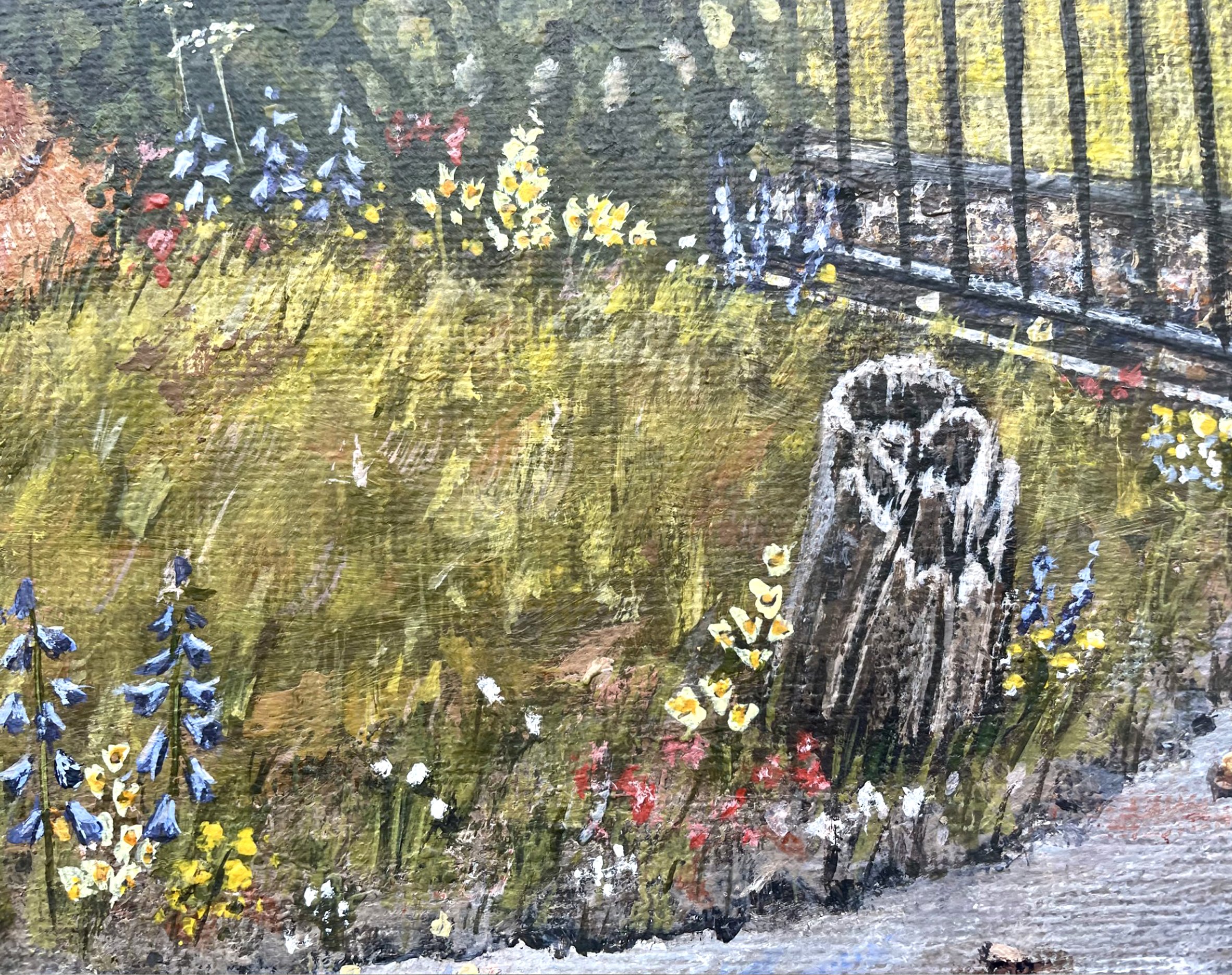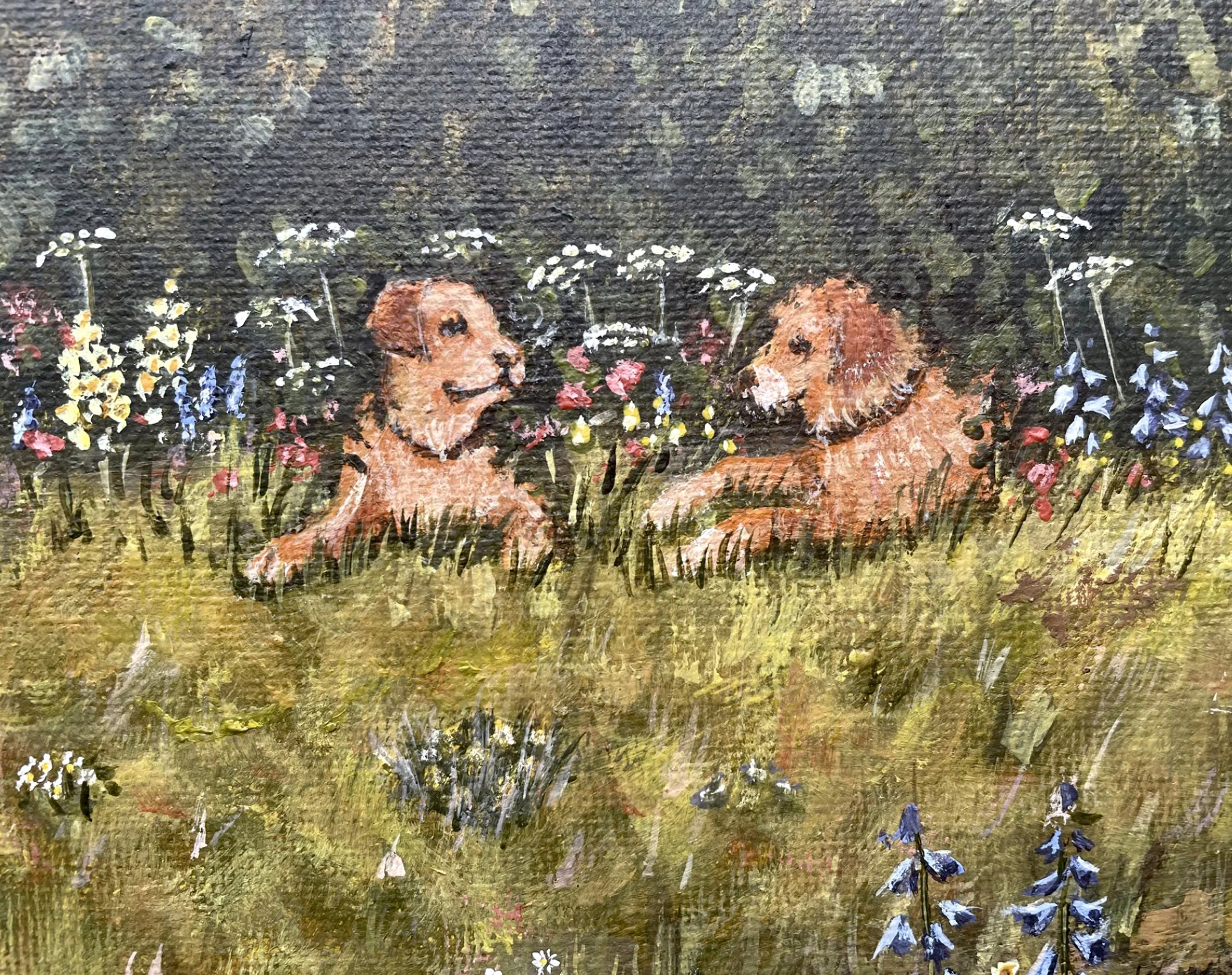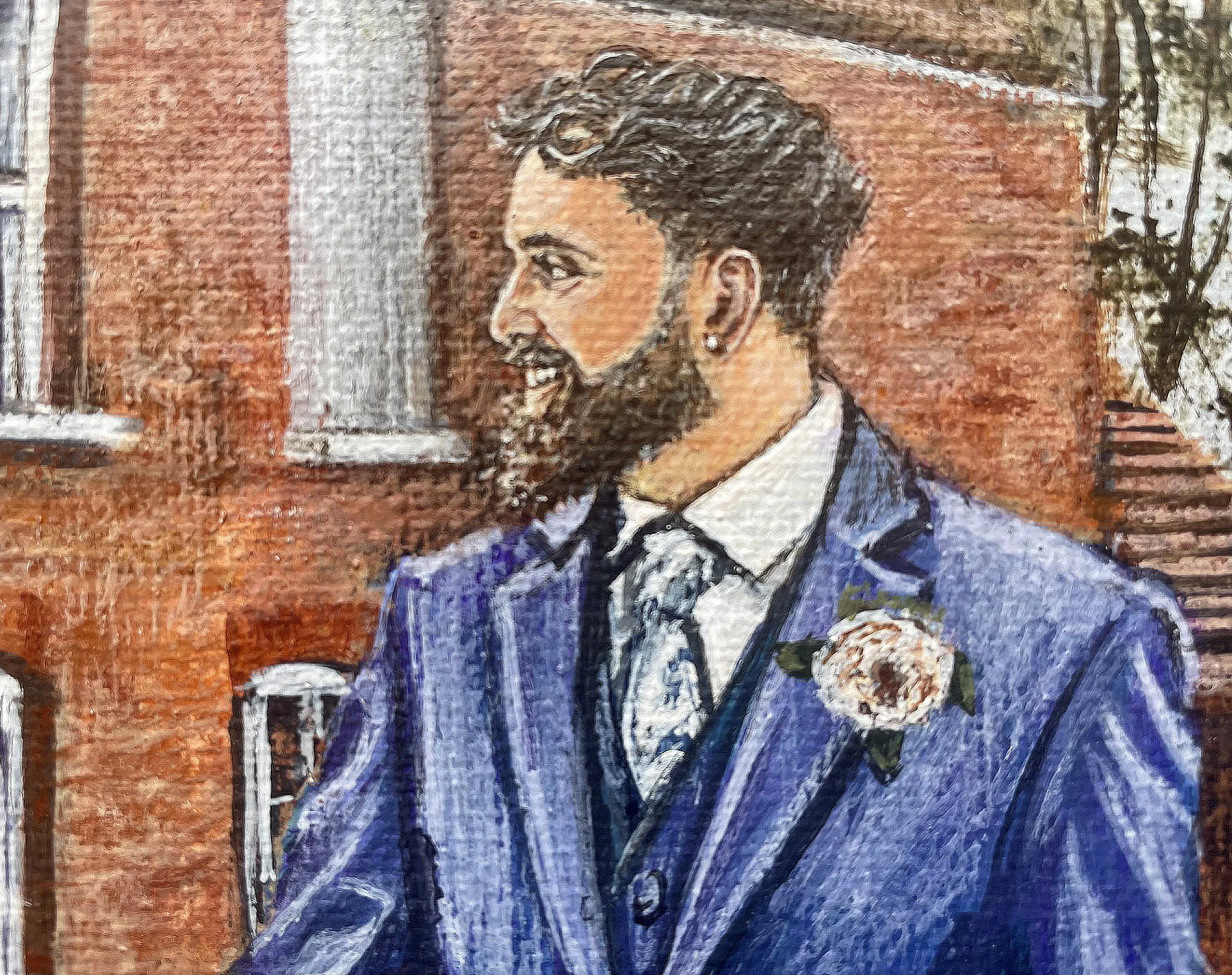 This commission holds extra meaning, featuring Millie’s childhood home in the background — a place deeply significant to her and her family. Their beloved fur babies, Archie and Roo, also make an appearance and I added some wildflowers — subtly, so as not to pull focus from the couple.